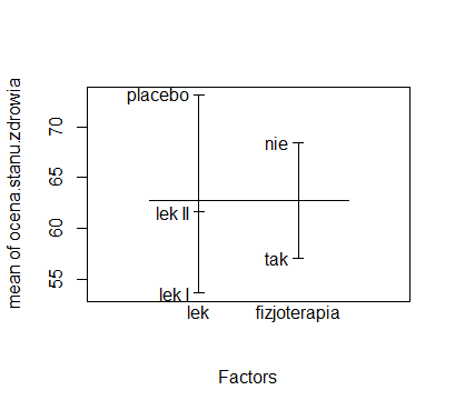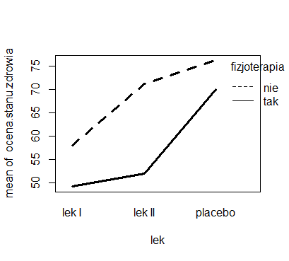 W omawianym przykładzie krzywe nie są równoległe. Największe zróżnicowanie wyników powodowane prowadzeniem jednoczesnej fizjoterapii obserwujemy u pacjentów, którzy stosowali lek II. Jednak różnica ta nie powoduje istotnych różnic w nachyleniu krzywych. W wyniku przeprowadzonej analizy wariancji nie stwierdzono wpływu interakcji tych dwóch czynników.