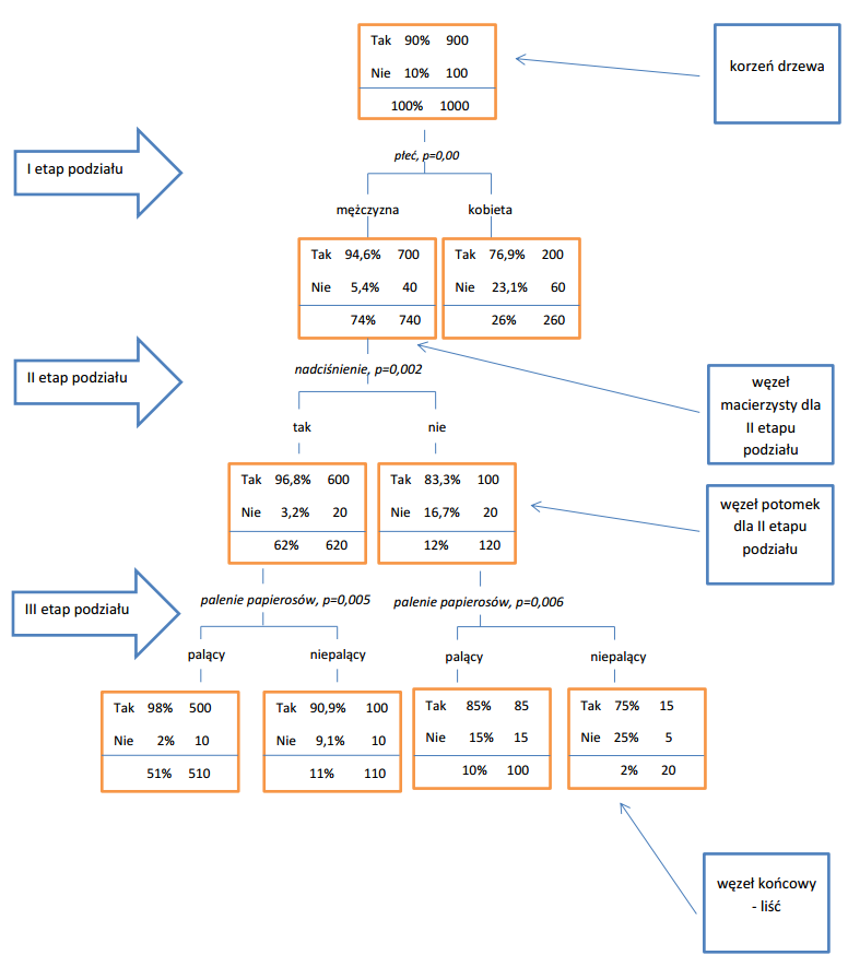 Z poniższego rysunku wynika, iż 90% badanej grupy przeszło w swoim życiu zawał. Informuje o tym rozkład zmiennej zaprezentowany w tzw. korzeniu drzewa. Spośród wszystkich dostępnych zmiennych algorytm wybrał tylko trzy, które różnicują zmienną objaśnianą (zachorowalność na zawał serca). Na tej podstawie drzewo wyróżniają trzy poziomy gałęzi, z czego drugi poziom wyrasta tylko z węzła pierwszego. Najistotniejszą zmienną różnicującą zachorowalność na zawał serca jest płeć. Na tą chorobę cierpi 94,6% mężczyzn oraz 76,9% kobiet. Informują o tym rozkłady procentowe w poszczególnych węzłach drzewa. Jeśli chodzi o grupę mężczyzn, kolejną istotną cechą determinującą zachorowalność jest występujące nadciśnienie. Dalsza interpretacja będzie dotyczyć jedynie mężczyzn. Spośród mężczyzn, którzy cierpią na nadciśnienie, 96,1% przeszło zawał, natomiast spośród mężczyzn, którzy nie mają nadciśnienia, zawał przeszło 83,3% osób. Ostatnią zmienną według której dokonano podziału jest zmienna "palenie papierosów". Z rysunku wynika, że 98% osób płci męskiej, które cierpią na nadciśnienie i palą papierosy oraz 85% mężczyzn niemających problemu z nadciśnieniem, ale palących papierosy, przeszło w swoim życiu zawał serca. Wśród mężczyzn, którzy mają problem z nadciśnieniem, ale nie palą papierosów, zachorowalność na zawał serca wynosi 90,9%, natomiast 75% mężczyzn, których nie dotyczy problem nadciśnienienia i nie palą papierosów, cierpi na tą chorobę. Drzewo CHAID umożliwiło stworzenie wizualnej oceny cech różnicujących zachorowalność na zawał serca.